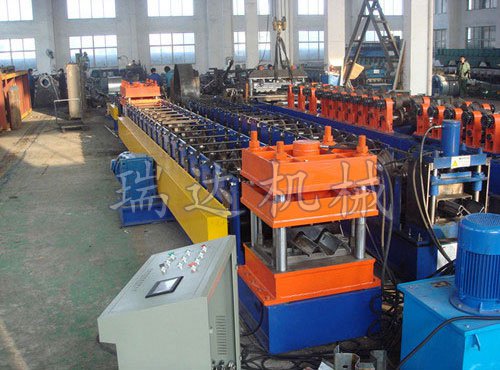 高速護(hù)欄成型機(jī)主要由開(kāi)卷機(jī)、校平機(jī)、沖孔機(jī)、沖中孔機(jī)、成型主機(jī)、成型剪切裝置、液壓站、成品托架等幾部分組成。